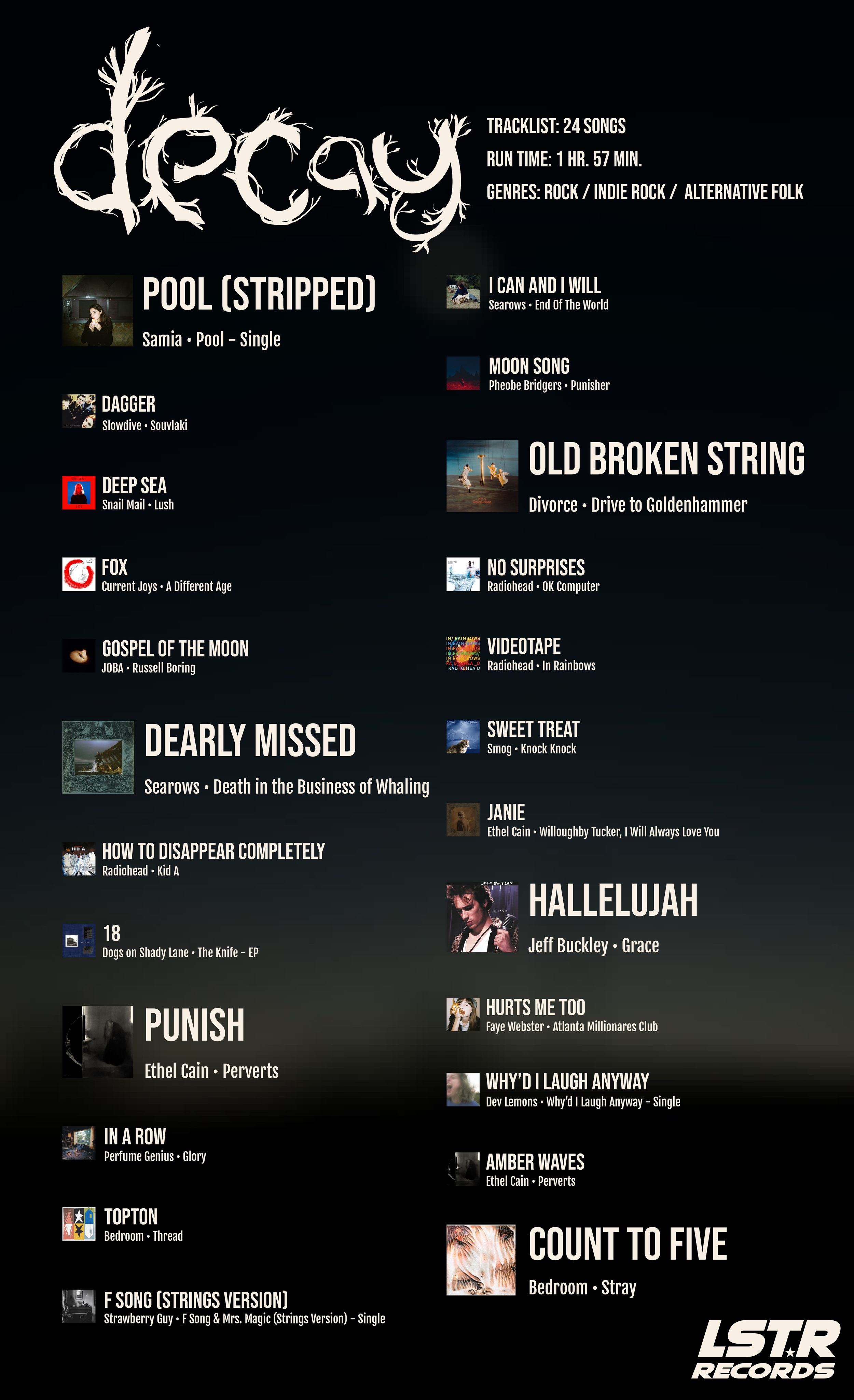 Decay is a playlist created as an abstract exploration of seasonal depression, and the need for love that blossoms in trying periods. The complexities of the weathers effect on human psychology, particularly my own, drives the message of this playlist, but its romantic undertones is great for the yearners.